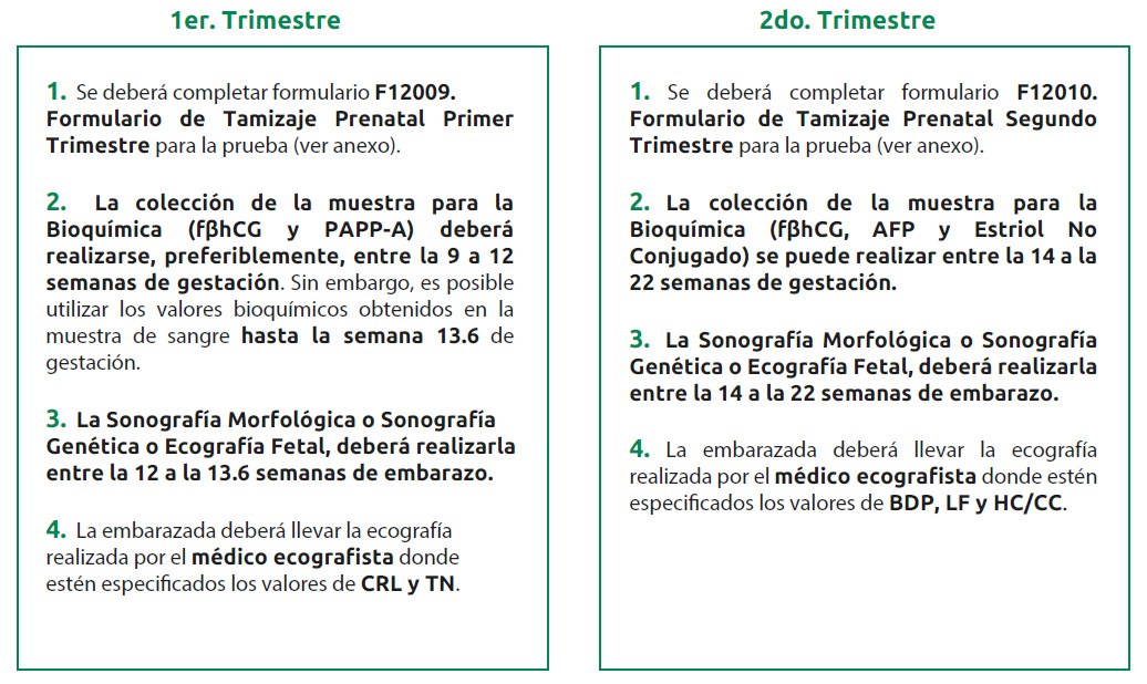 Mientras que, el Tamizaje Prenatal del Segundo Trimestre Combinado es utilizado en embarazadas con más de 14 semanas, tanto para determinar, evaluar y/o corroborar el riesgo para anomalías fetales y Defectos del Tubo Neural (DNT).